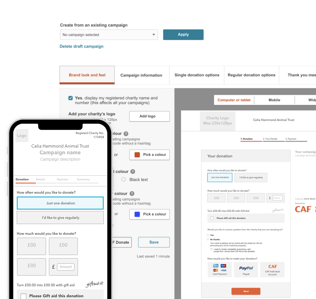 I designed a new campaign set-up wizard for more than 10,000 charities to create dedicated donation pages, ready to embed on their websites for one-off projects or ongoing campaigns.We made it much easier for charities to setup and amend their campaigns more efficiently, we reduced the time for customer support saving the company effort, time and money and caused positive word of mouth with recommendations for our product. Customers can instantly preview their campaigns across multiple devices.