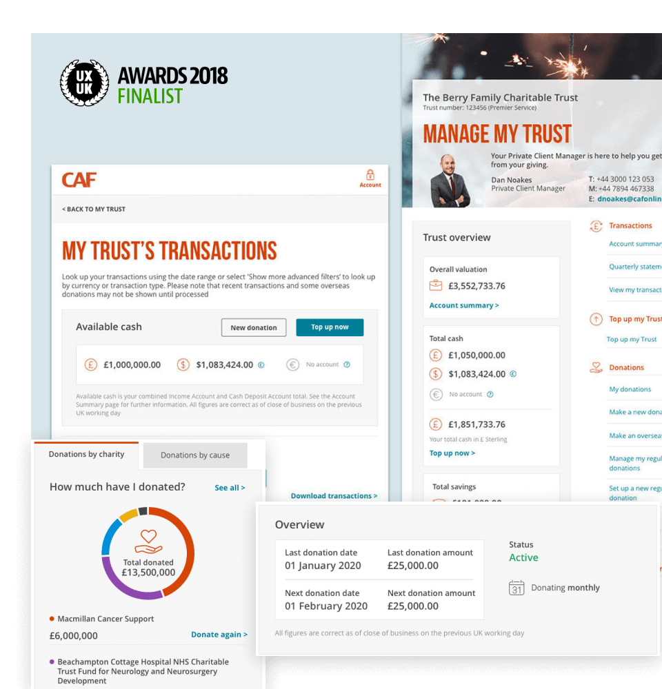 Redesign provided expert guidance to individual donors, helping optimise their giving plans across the UK and internationally. This led to a 26% increase in donations to charities in 2021/22.Finalist at the UX UK Awards 2018 in the categories of Best User Experience and Best Impact on Business Goals.