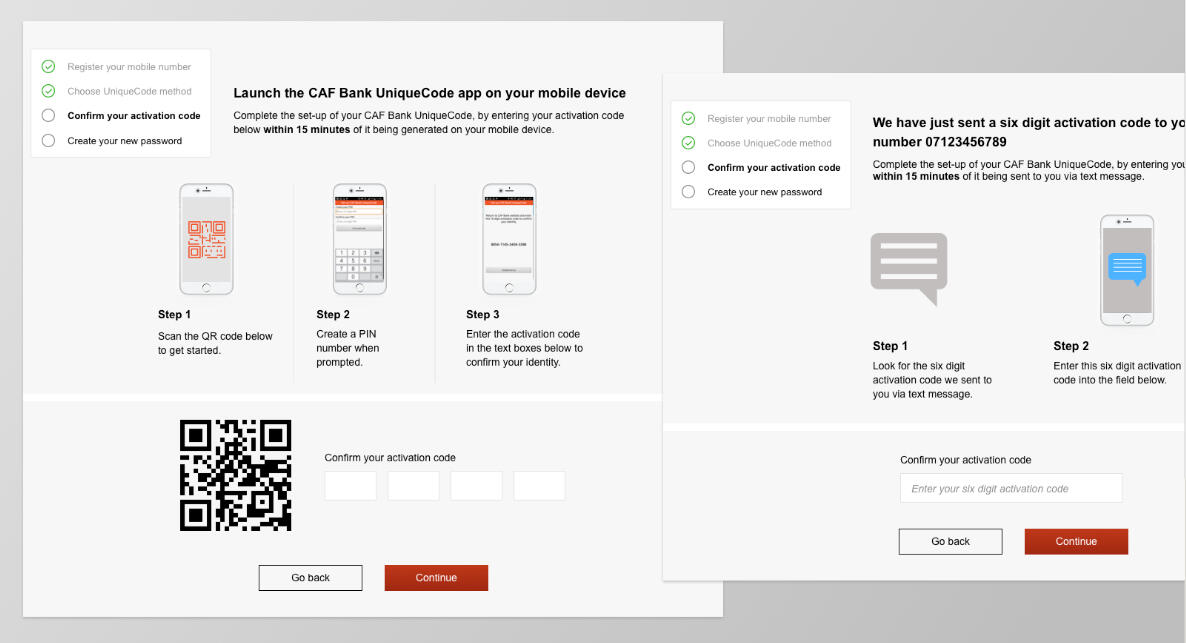 As UX Lead, I played a key role in delivering CAF Bank’s two-factor authentication solution, enhancing security while maintaining a seamless customer experience.I led workshops, defined user journeys, and designed end-to-end prototypes for a critical security upgrade required to meet PSD2 regulatory standards. The solution enables customers to choose how they receive their codes - via SMS or app - and integrates this step into key actions such as login, payments, and account updates.Working cross-functionally with IT, Compliance, CAF Bank stakeholders, and external partners, I ensured alignment across teams and delivered the project on time. I balanced strict regulatory and technical requirements with user needs, creating a solution that is intuitive, accessible, and used frequently by charity customers.By leading the design in-house, I also reduced reliance on external agencies, delivering high-quality outputs while saving the business significant costs.