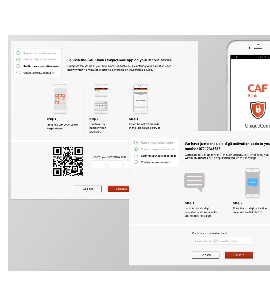 As UX Lead, I played a key role in delivering CAF Bank’s two-factor authentication solution, enhancing security while maintaining a seamless customer experience.I led workshops, defined user journeys, and designed end-to-end prototypes for a critical security upgrade required to meet PSD2 regulatory standards. The solution enables customers to choose how they receive their codes - via SMS or app - and integrates this step into key actions such as login, payments, and account updates.Working cross-functionally with IT, Compliance, CAF Bank stakeholders, and external partners, I ensured alignment across teams and delivered the project on time. I balanced strict regulatory and technical requirements with user needs, creating a solution that is intuitive, accessible, and used frequently by charity customers.By leading the design in-house, I also reduced reliance on external agencies, delivering high-quality outputs while saving the business significant costs.